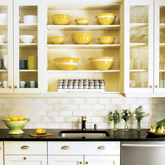 So, anyway, there's lots of inspiration out there. My small kitchen could benefit from the openess that open shelving creates, but I don't have enough cabinets to start with to give up the storage space. I may be able to add shelves along the one long wall in the space, but it still leaves questions for me.